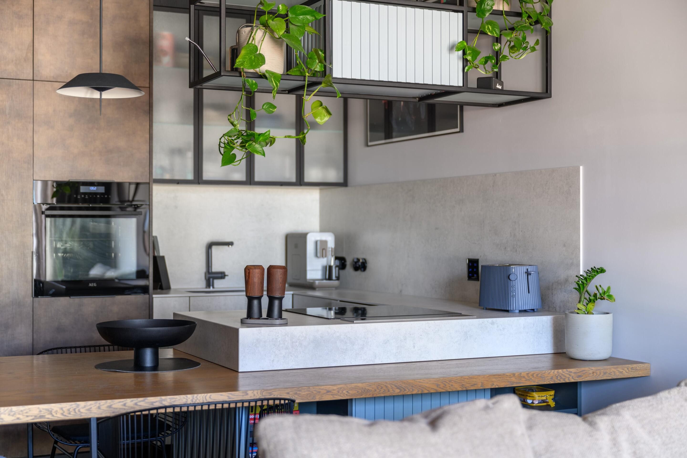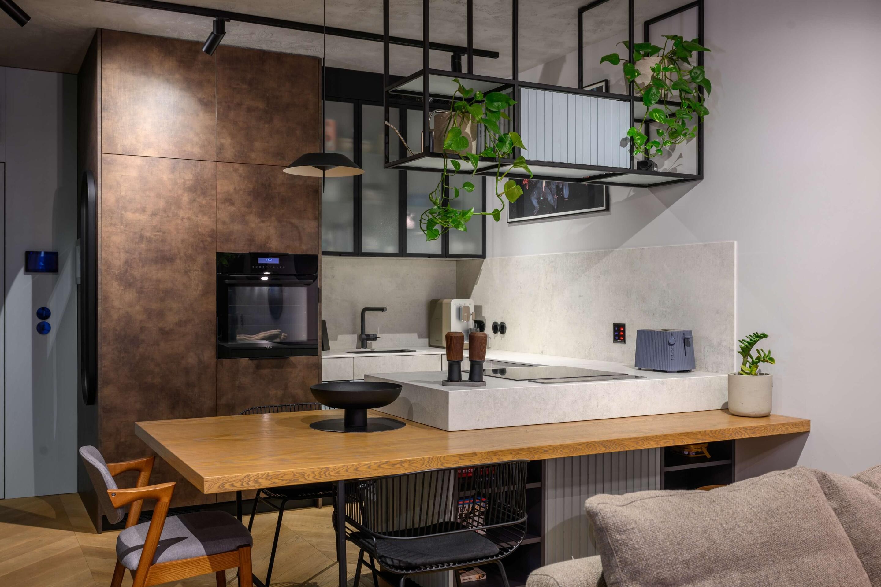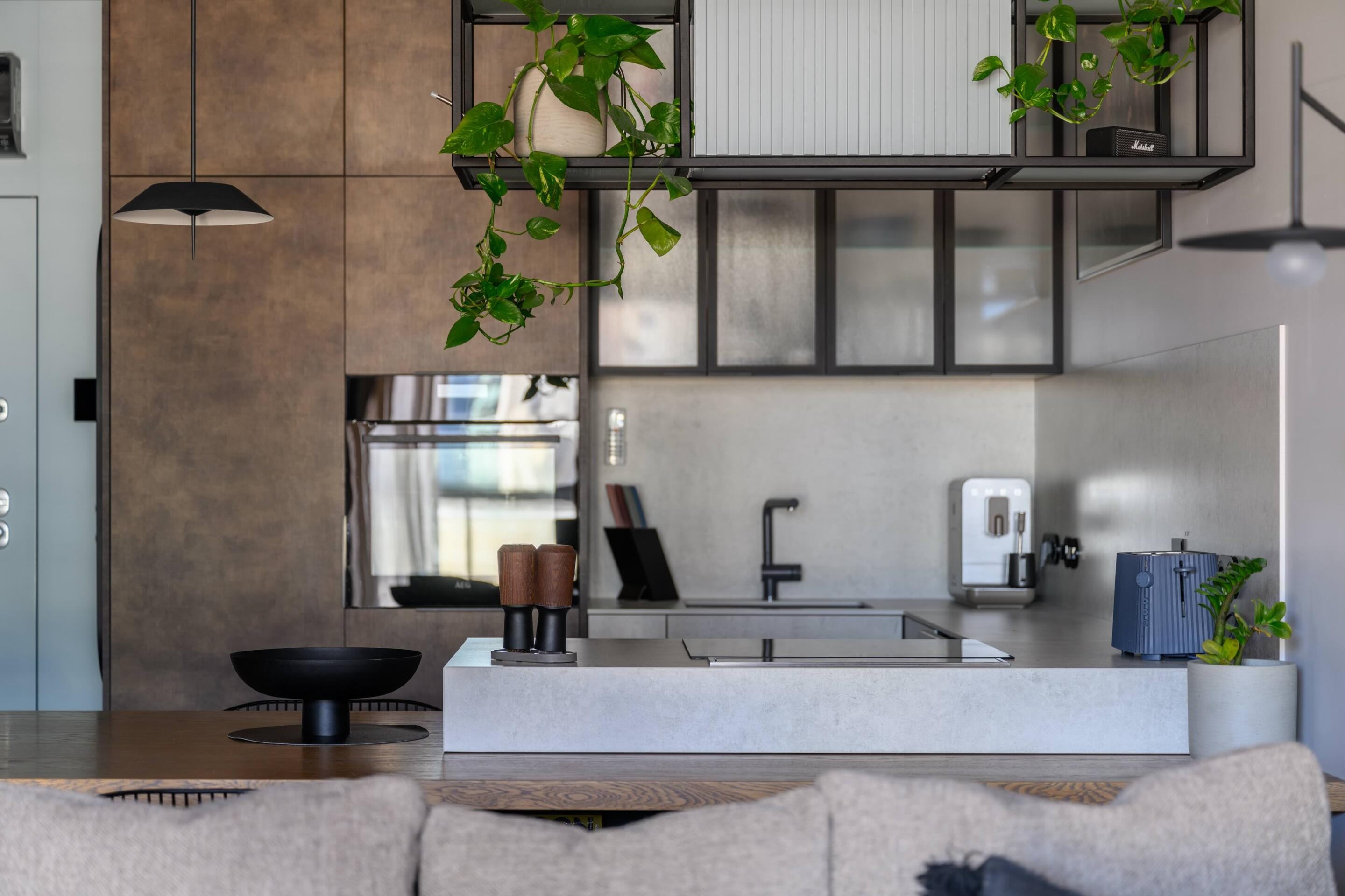 Sprzęty AGD premium: Płyta indukcyjna i okap marki Smeg, lodówka Liebherr, piekarnik AEG - wszystko wkomponowane w nowoczesną zabudowę.