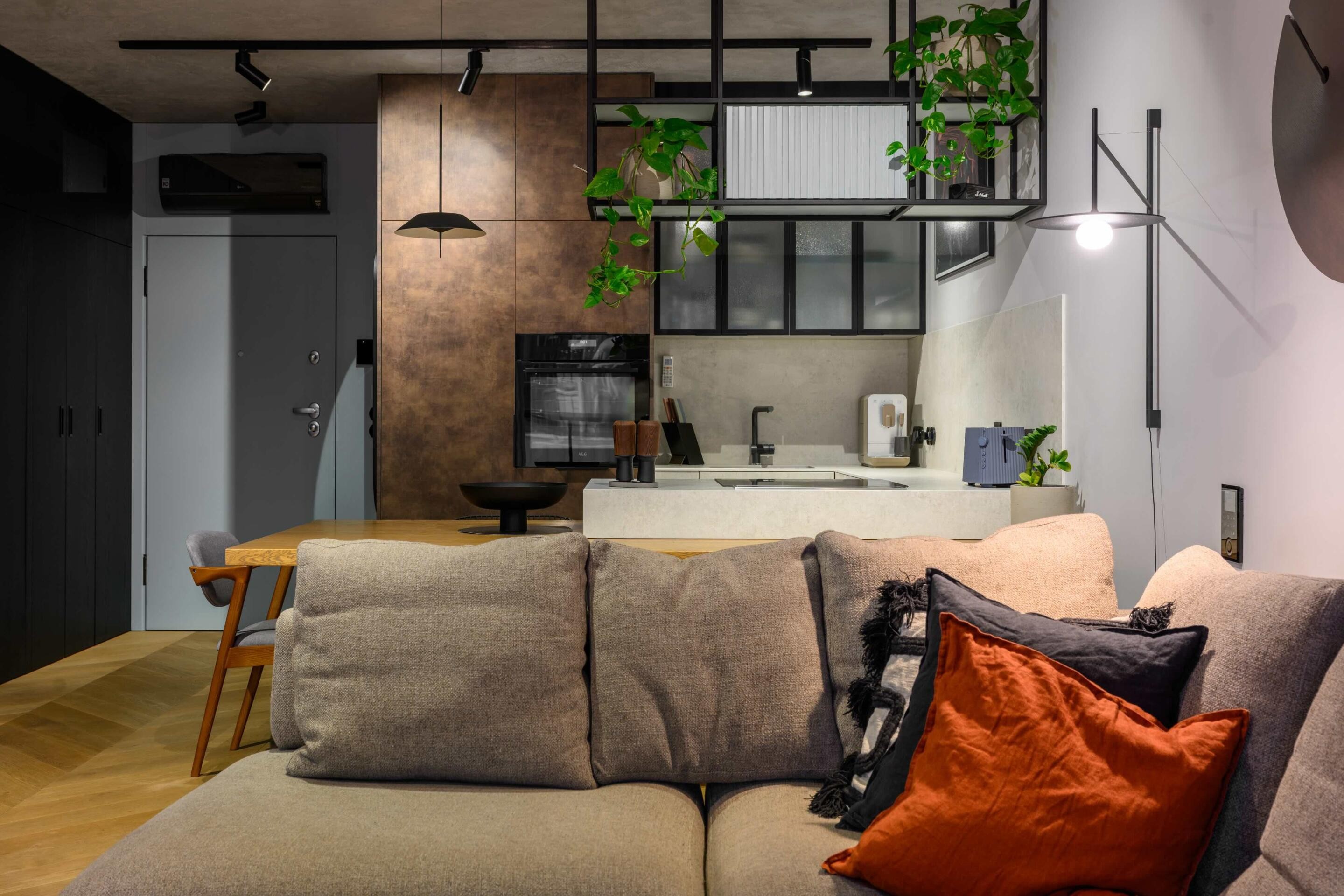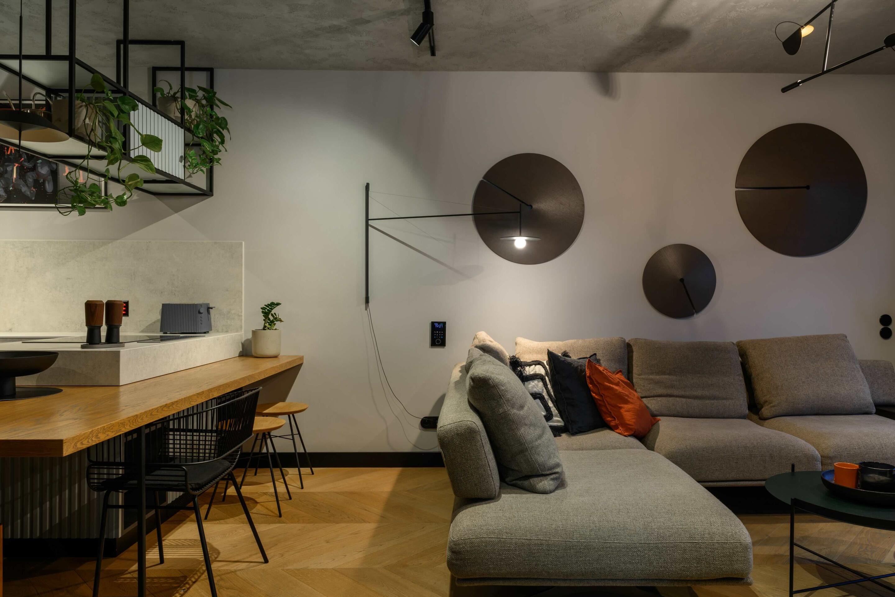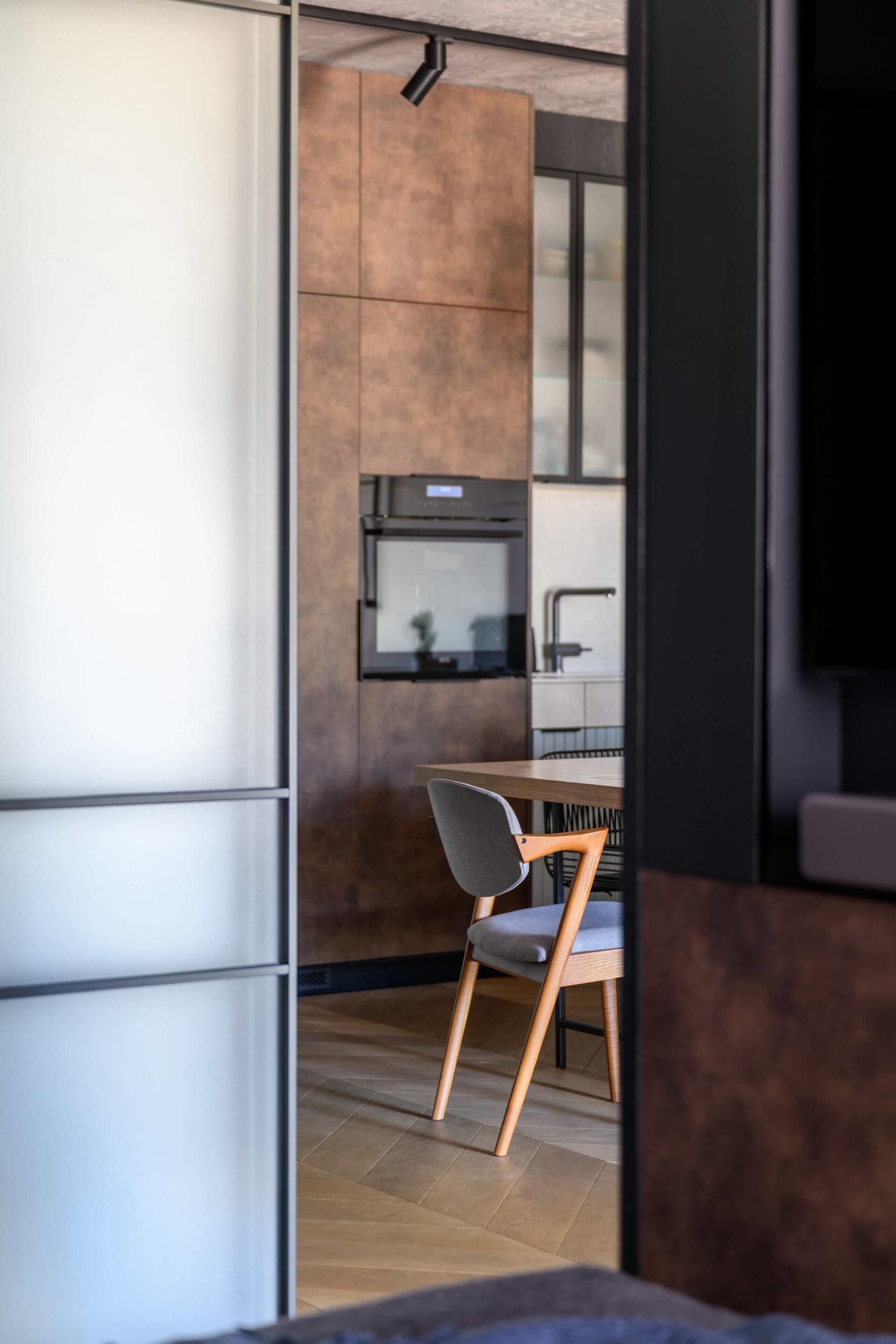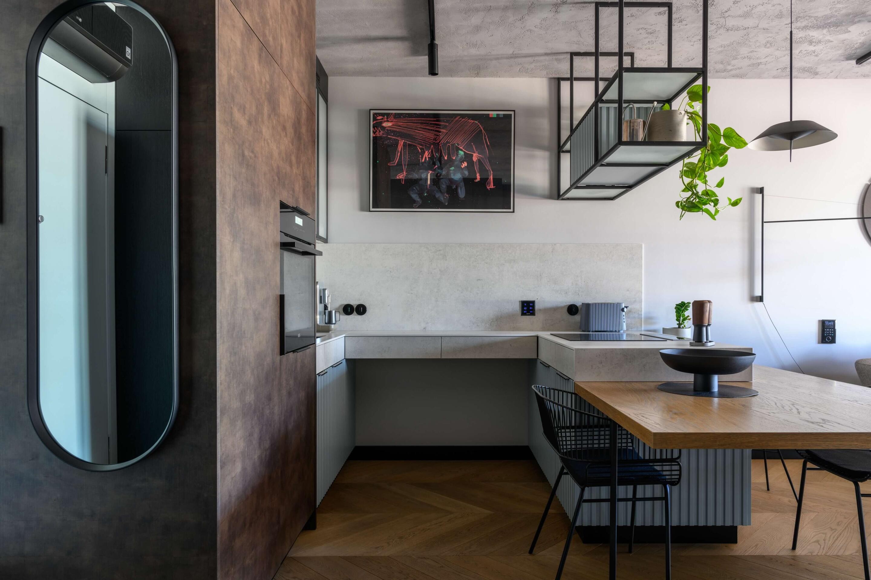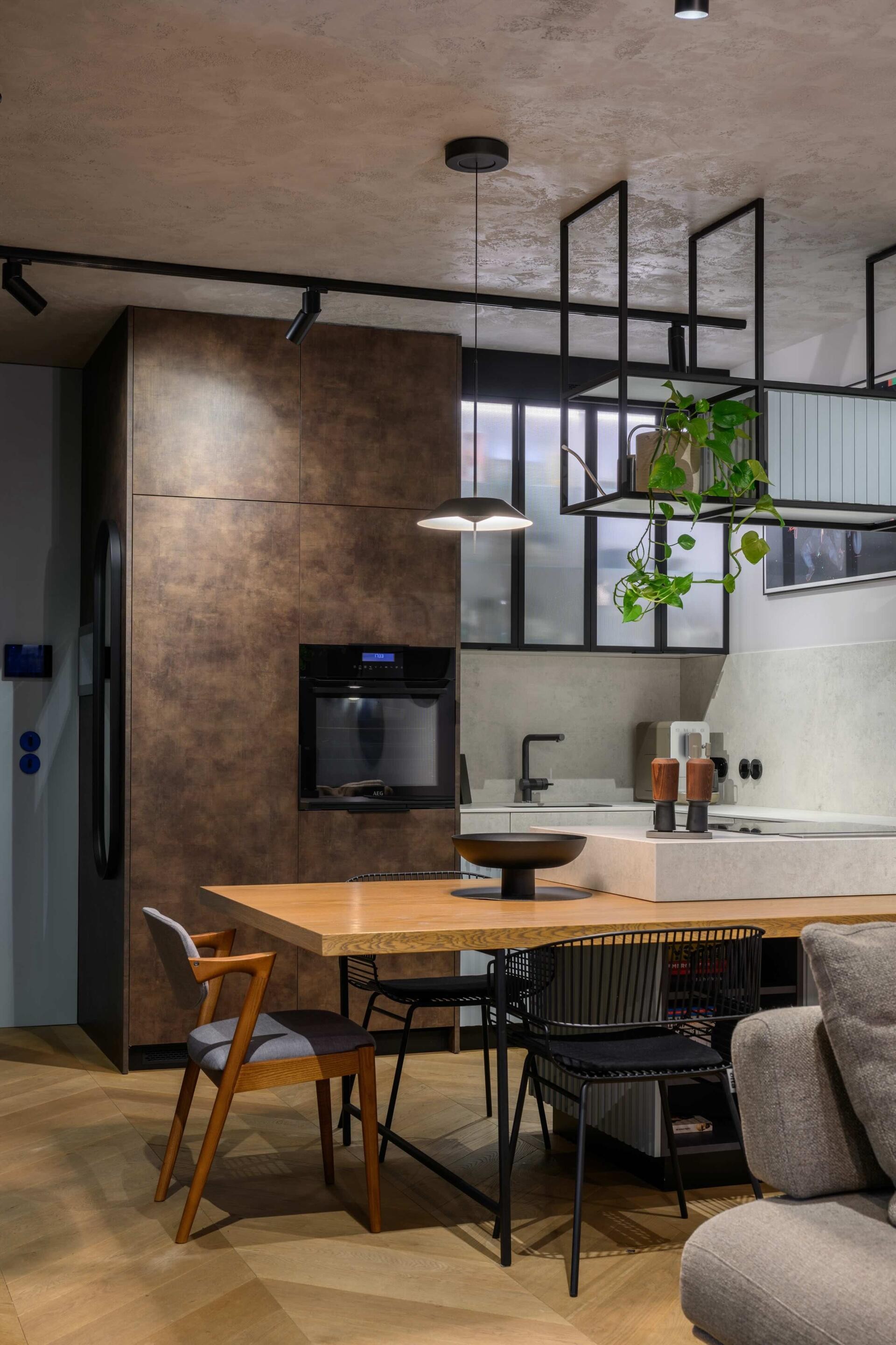 Wysoki standard wykończenia: Mieszkanie wykończone przy użyciu najwyższej jakości forniru, elementów stalowych oraz spieków kwarcowych, nadających wnętrzom elegancki i trwały charakter. Dębowa podłoga ułożona w elegancką jodełkę.