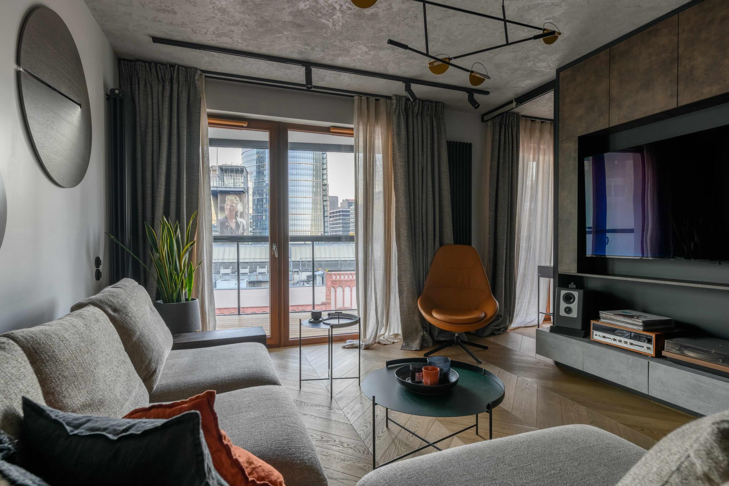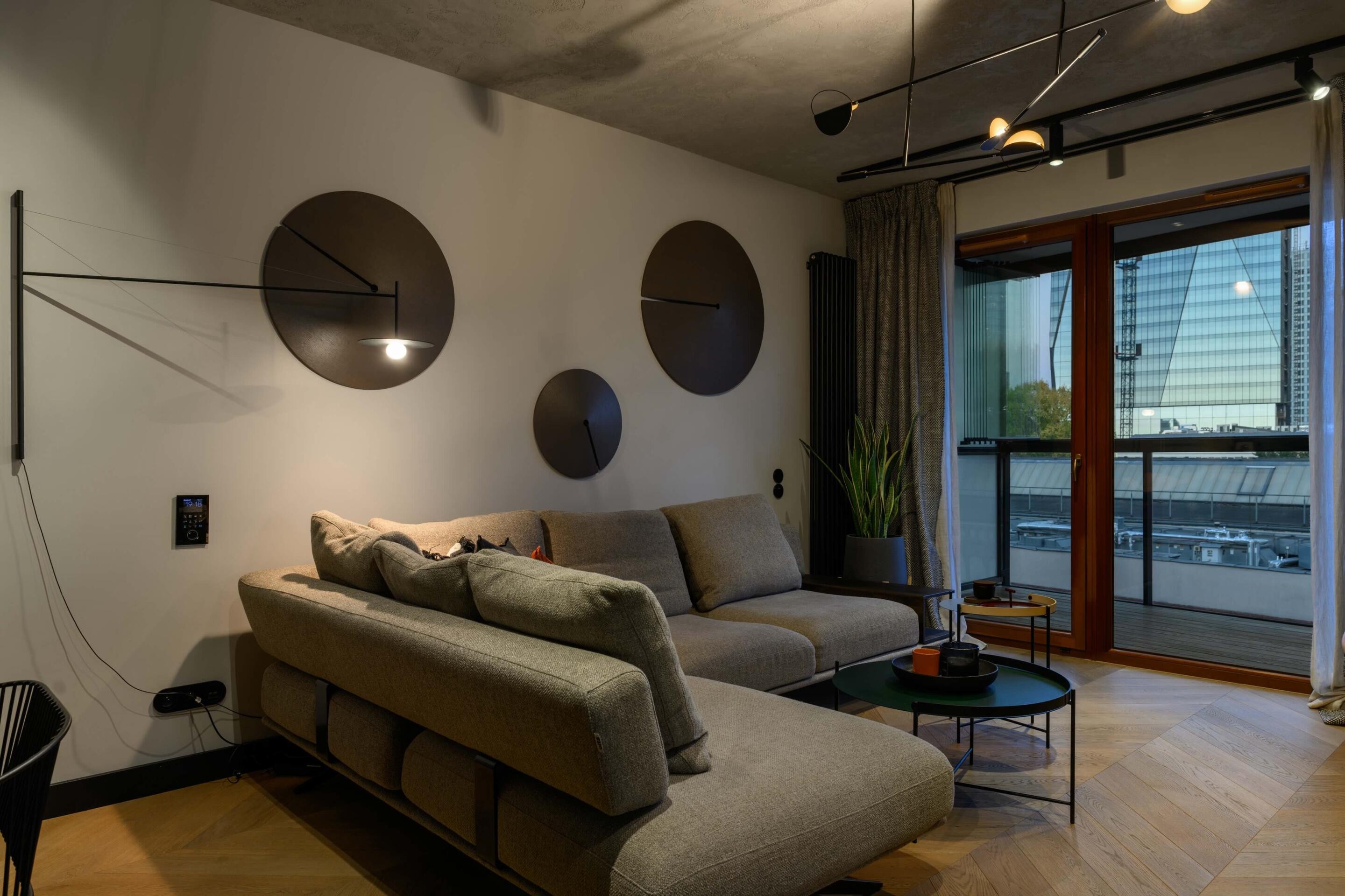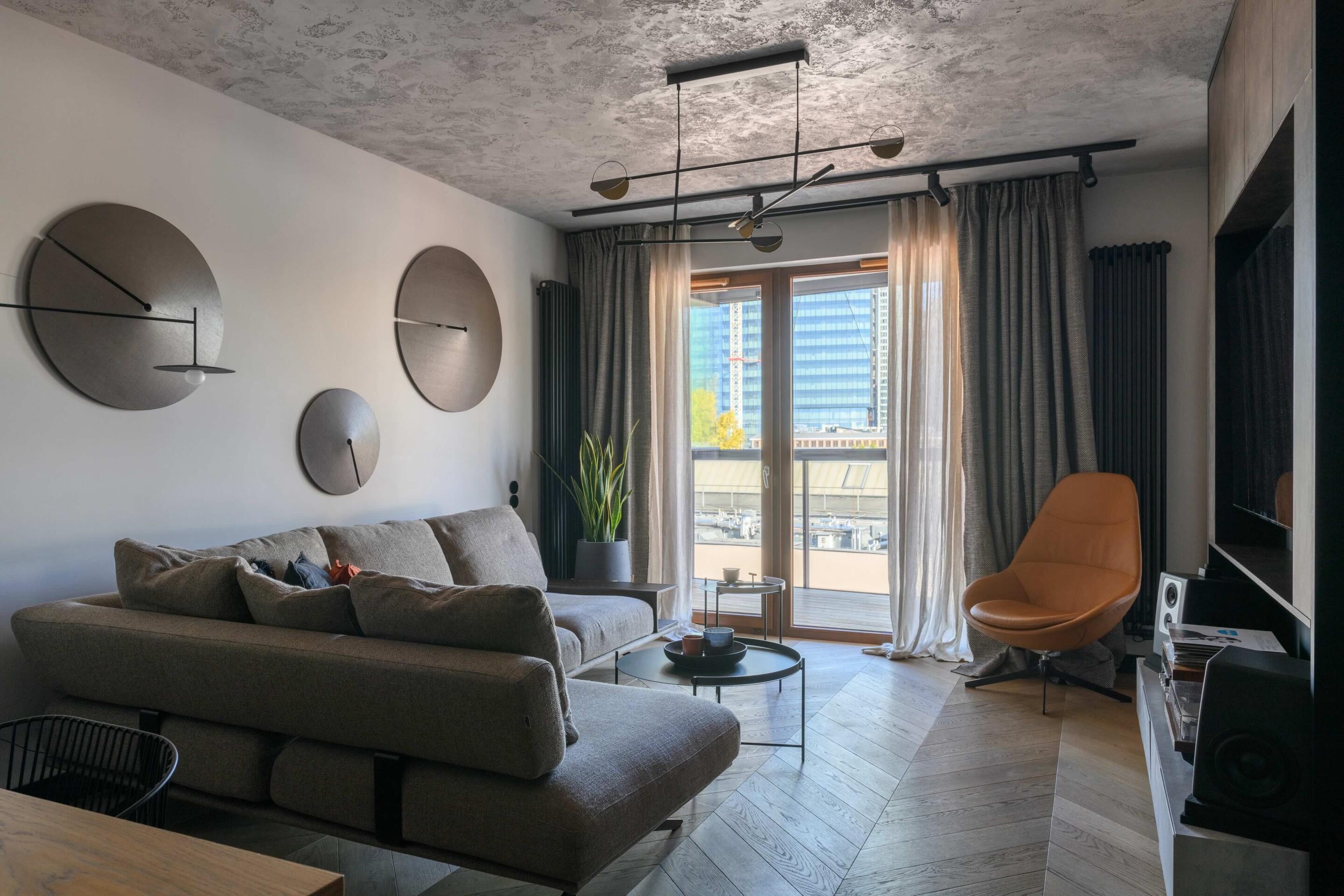 To nowoczesne i designerskie mieszkanie o powierzchni 50 m², położone jest na ostatnim piętrze kameralnego budynku przy ul. Przyokopowej (ulica odchodząca od ul. Grzybowskiej), z widokiem na Muzeum Powstania Warszawskiego i skyline rozciągający się wokół Ronda Daszyńskiego.