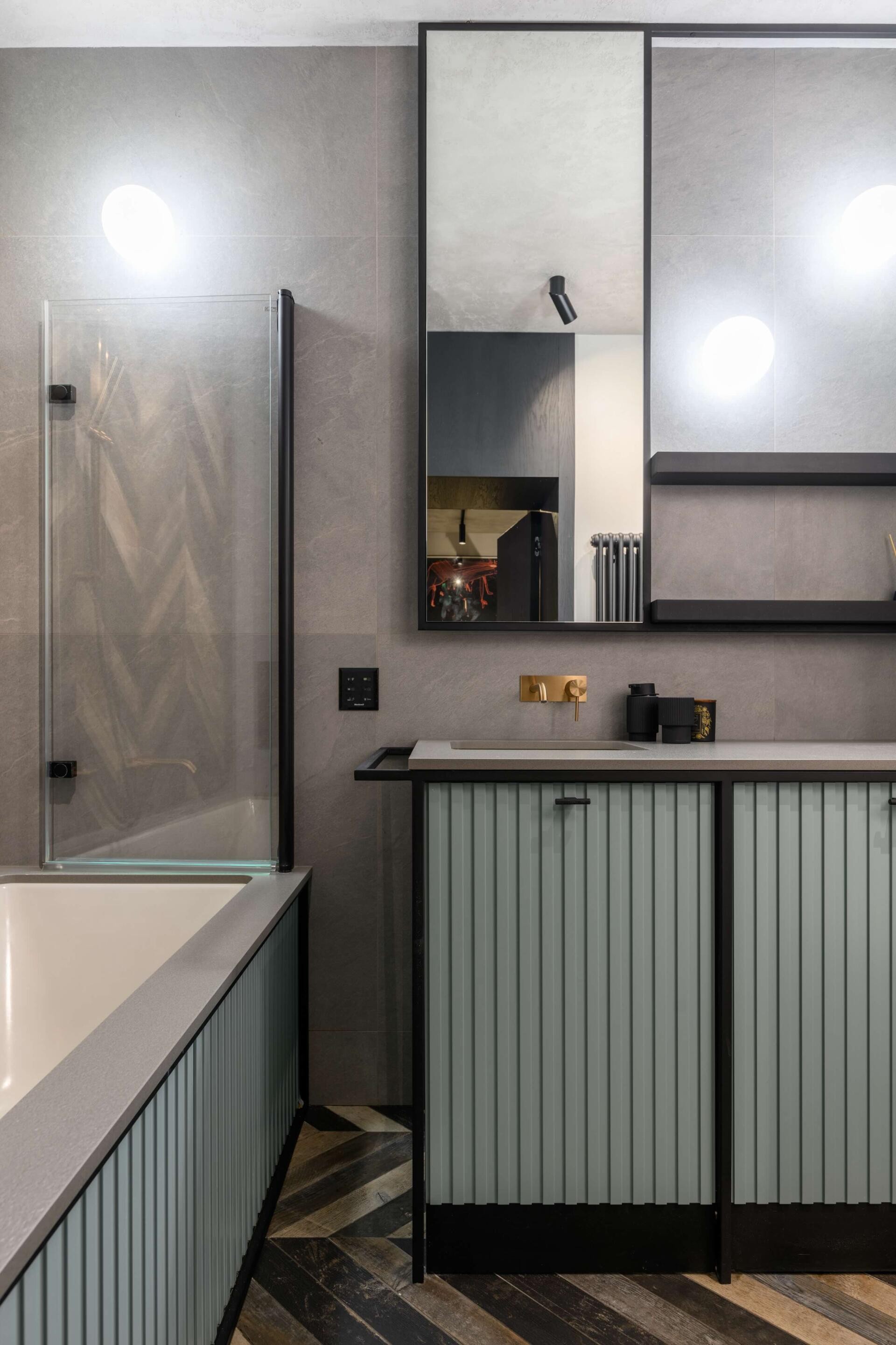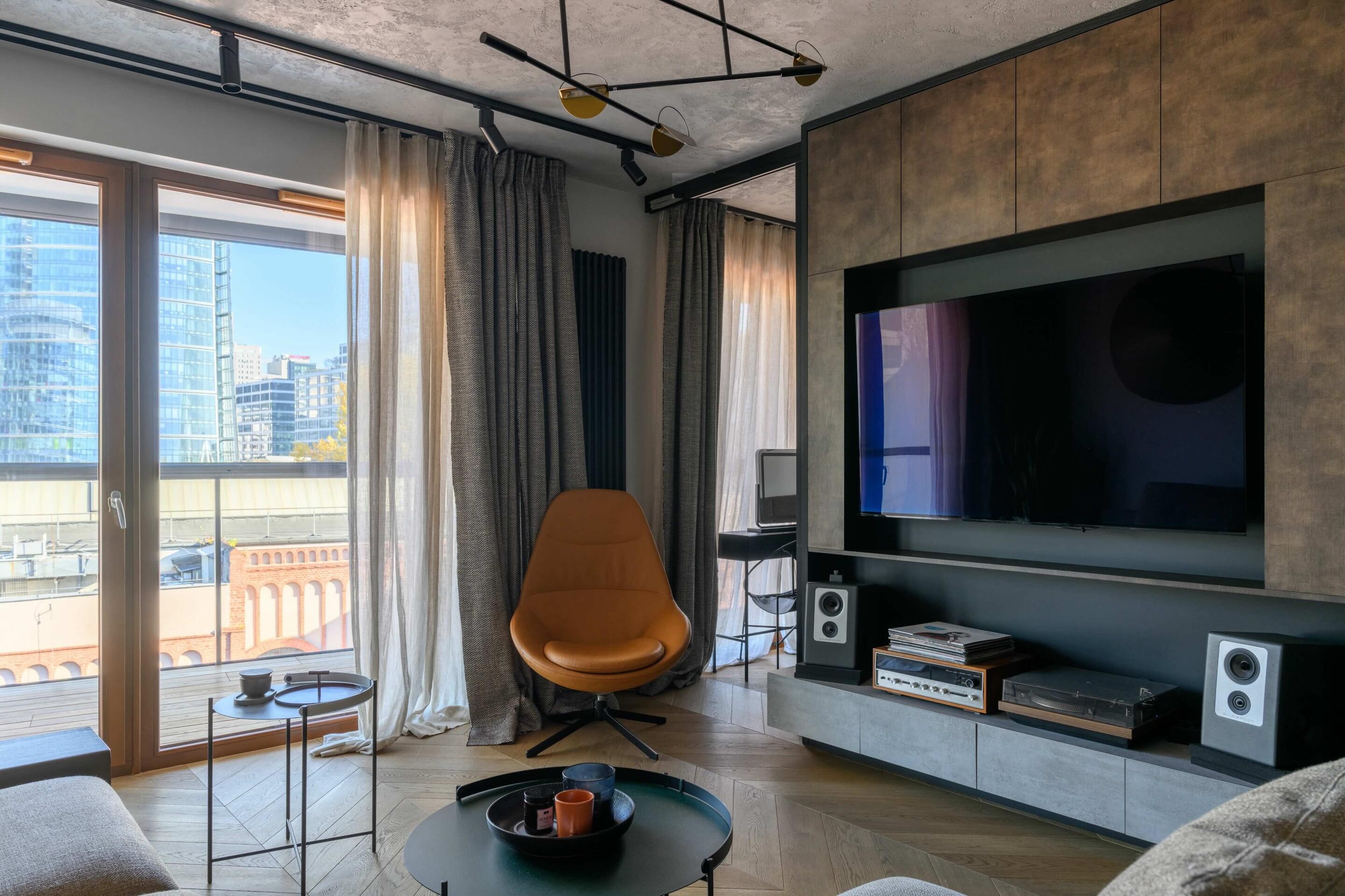 Technologia: 2 telewizory Sony o przekątnej 65 cali oraz dodatkowy telewizor 20-calowy ukryty za lustrem w łazience, na wysokości wanny. Głośniki w całym mieszkaniu, w tym dyskretnie ukryte w suficie łazienki.