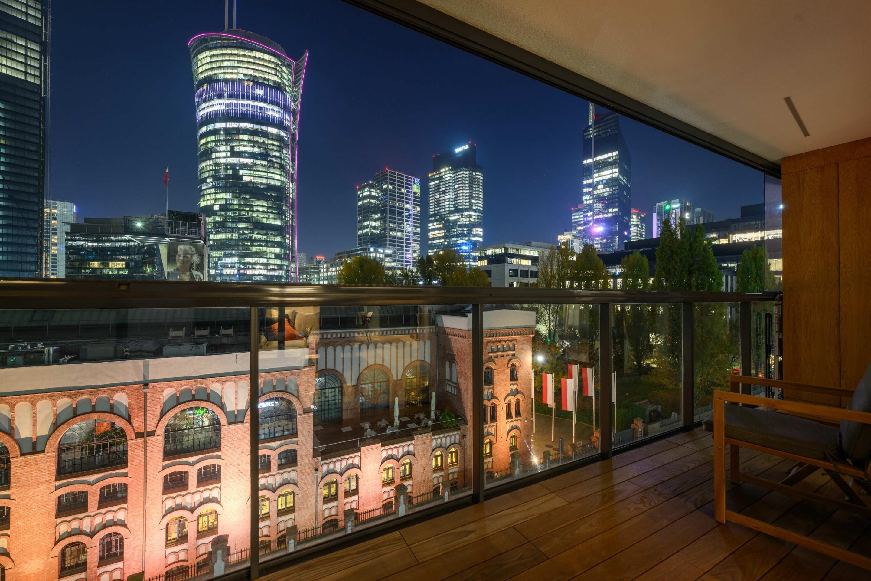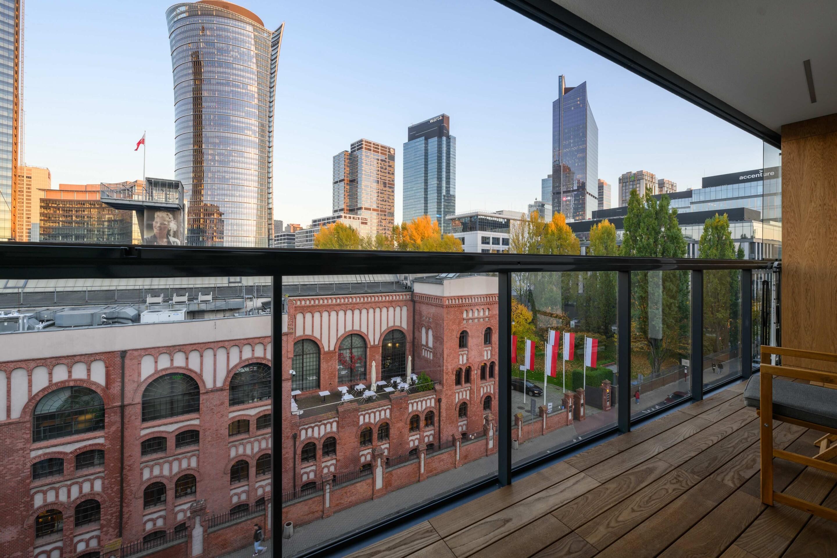 Balkon: Duży balkon wyłożony drewnem z wykonaną na zamówienie szafą zewnętrzną, z którego rozpościera się niepowtarzalny widok na panoramę miasta i nowoczesne wieżowce